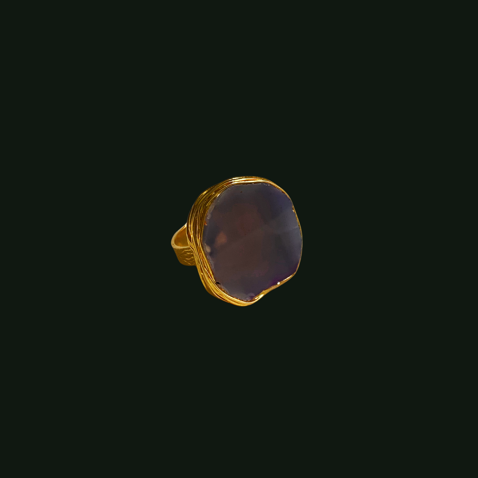 Dawn is an adjustable 18k gold plating on silver sterling ring featuring a large light lavender gem on a single band.