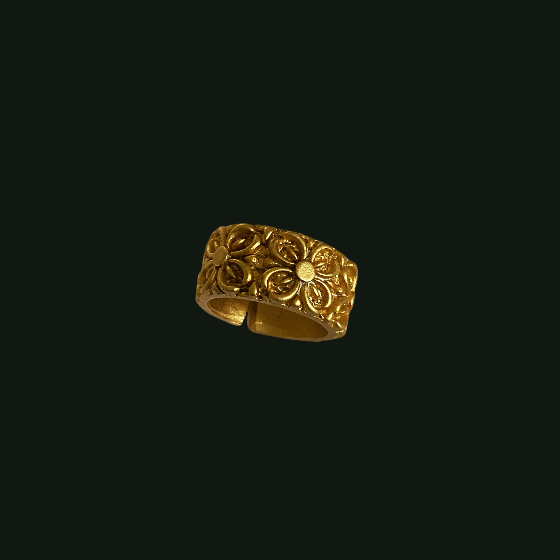Ila is an adjustable 18k gold plating on sterling silver band. It features a floral pattern with vintage detailing all around. This is a thick band which can be harder to adjust.