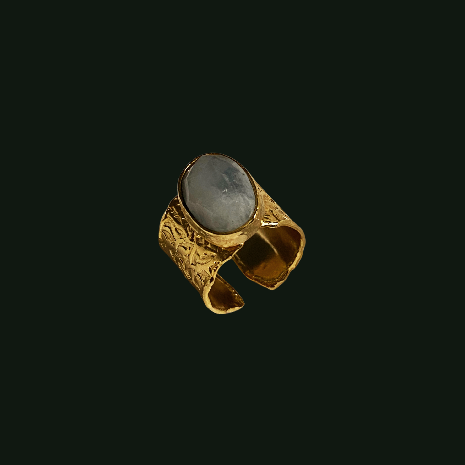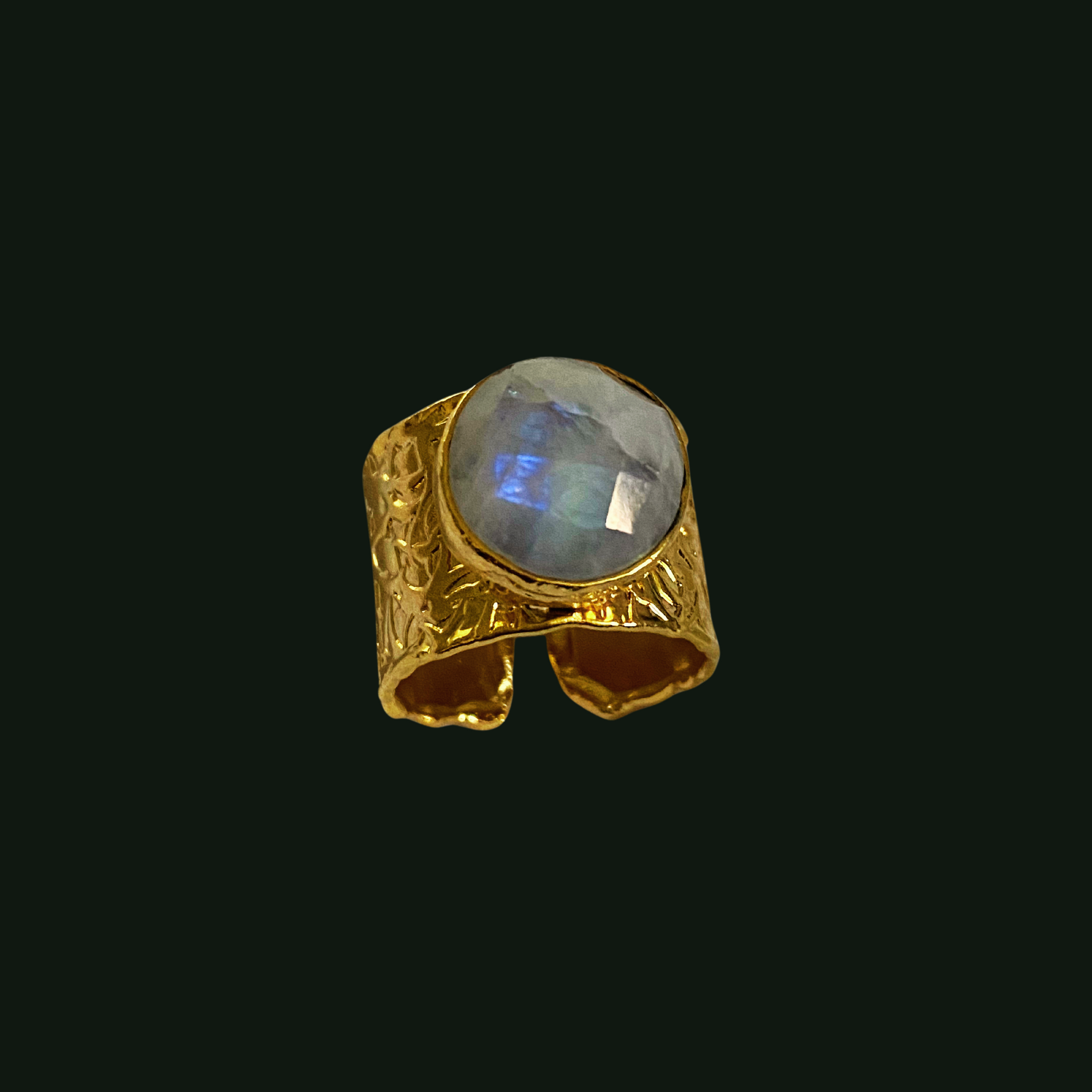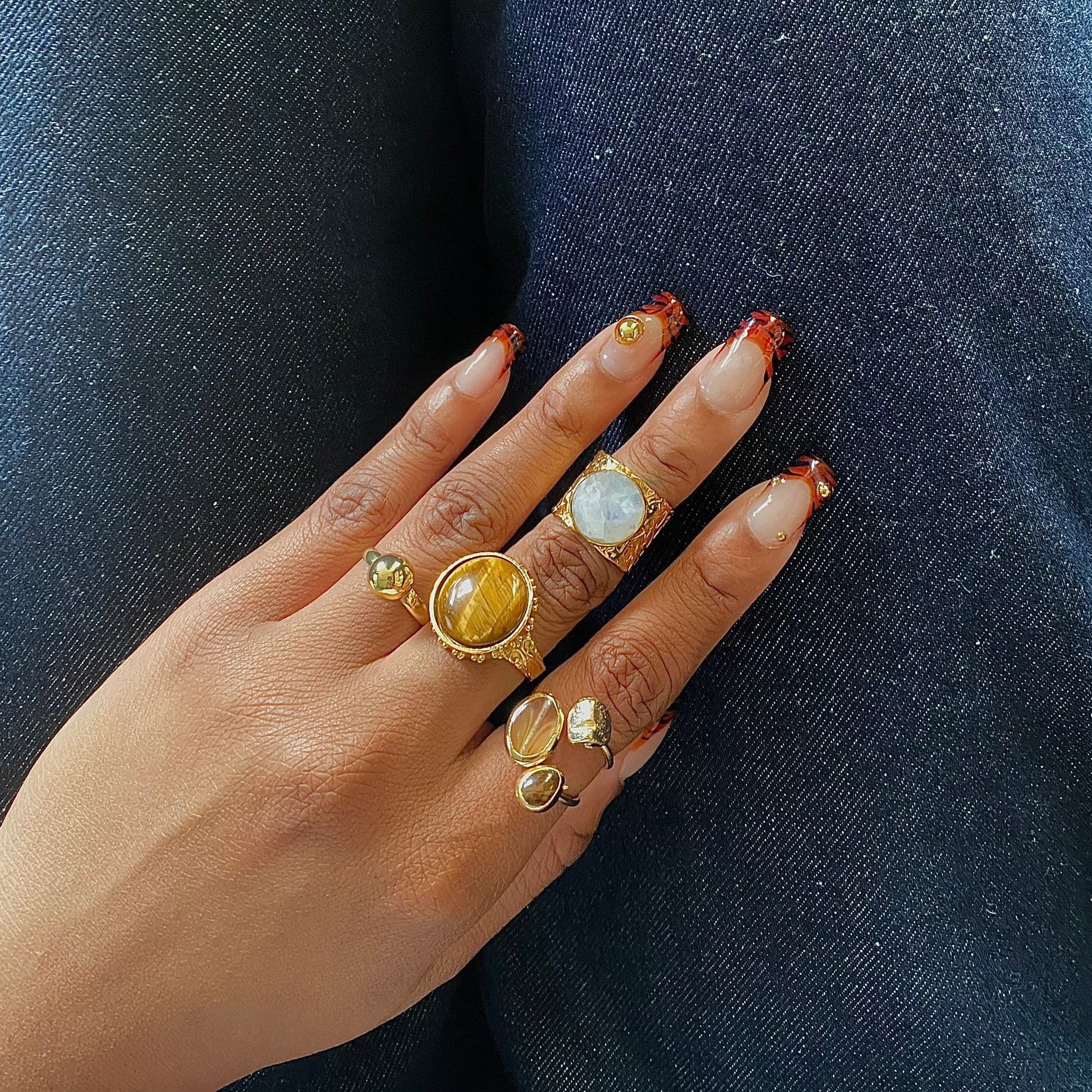 Jule is an adjustable 18k gold plating on sterling silver ring. It features a small gem encased in a thick gold band with intricate detailing.