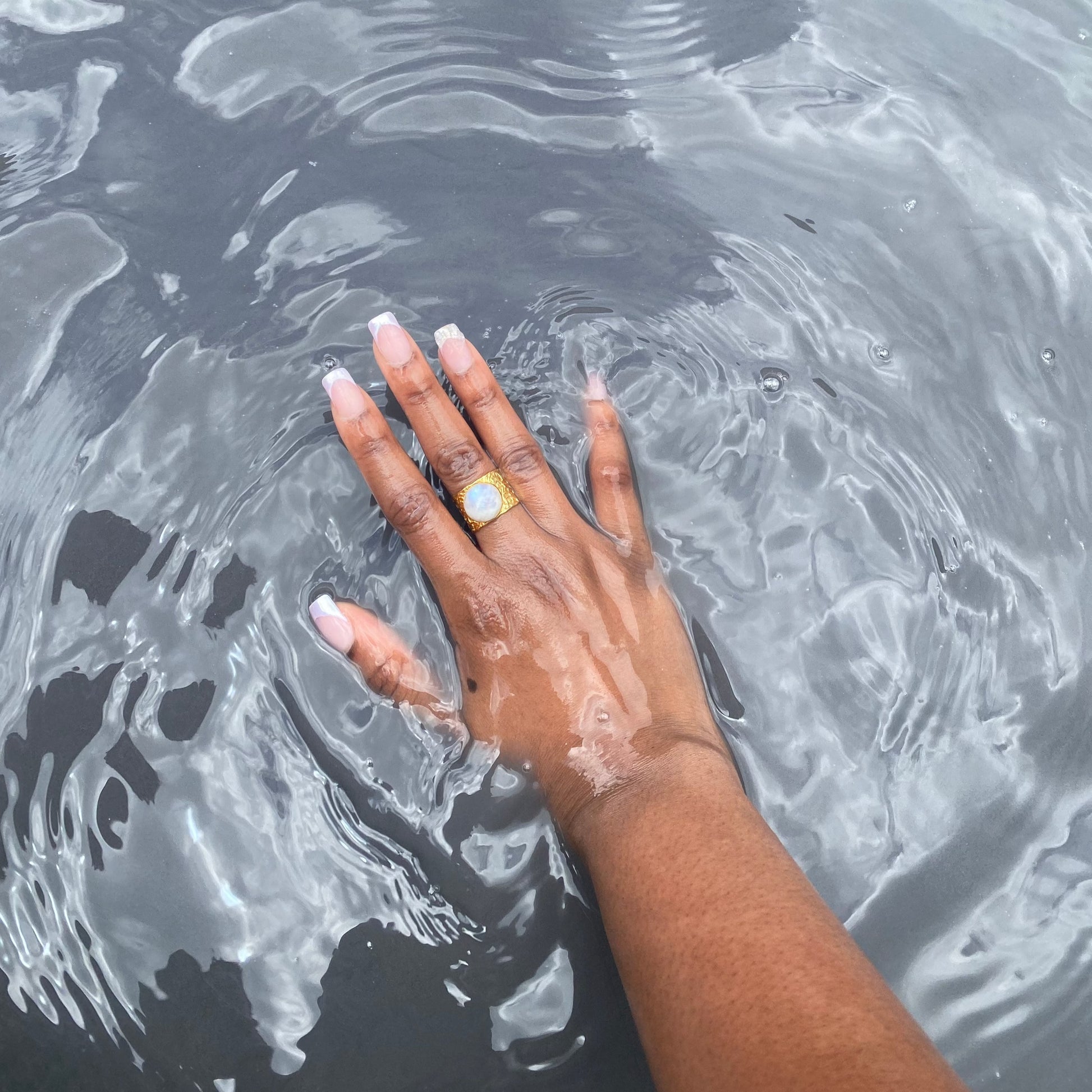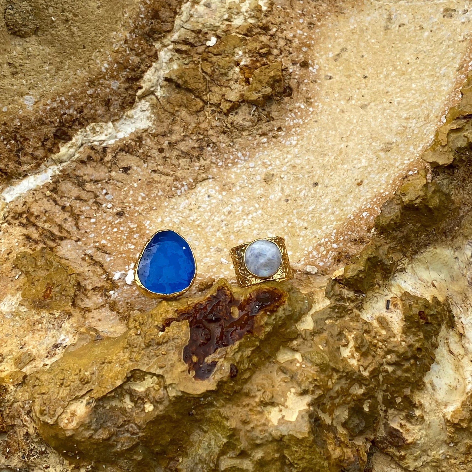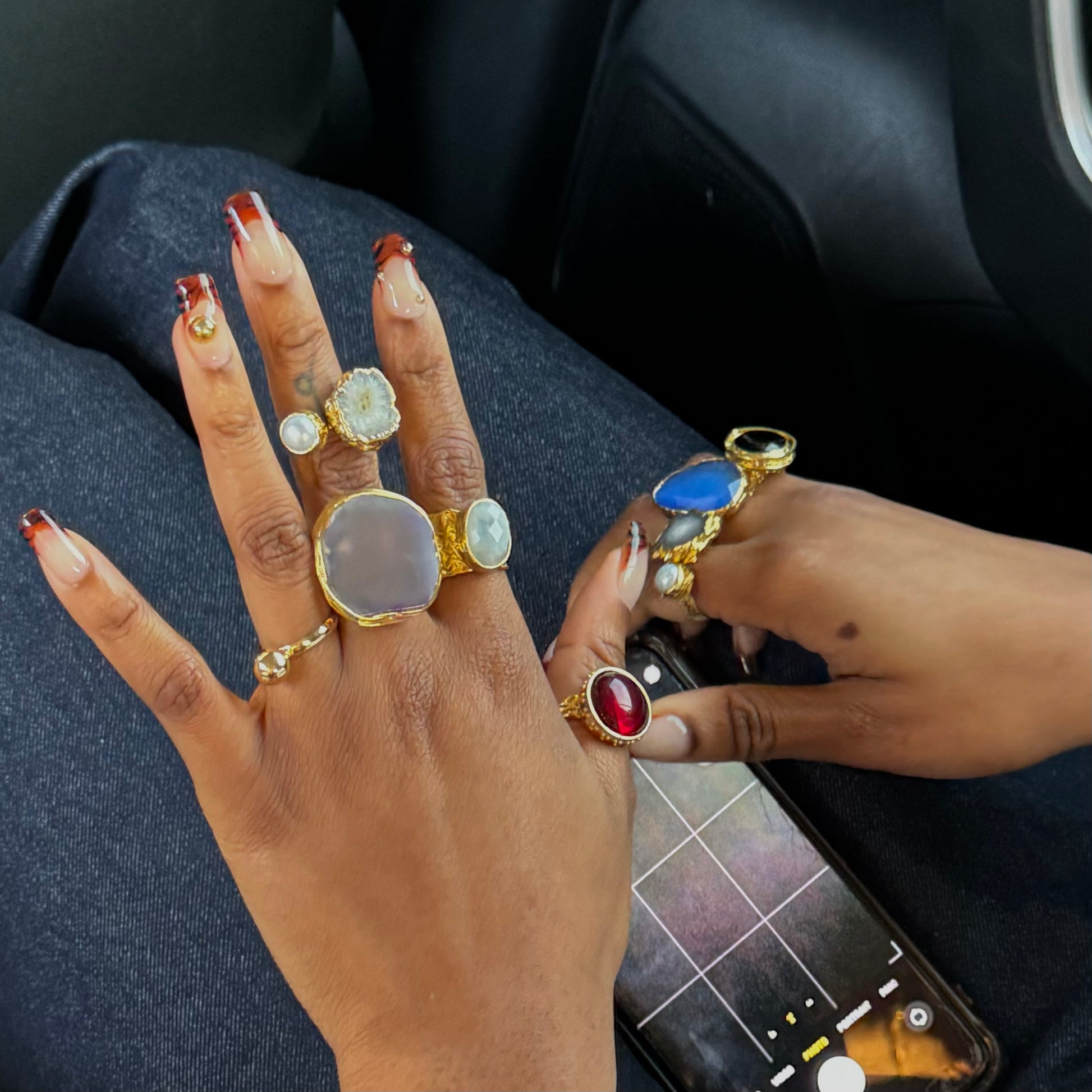 Jule is an adjustable 18k gold plating on sterling silver ring. It features a small gem encased in a thick gold band with intricate detailing.