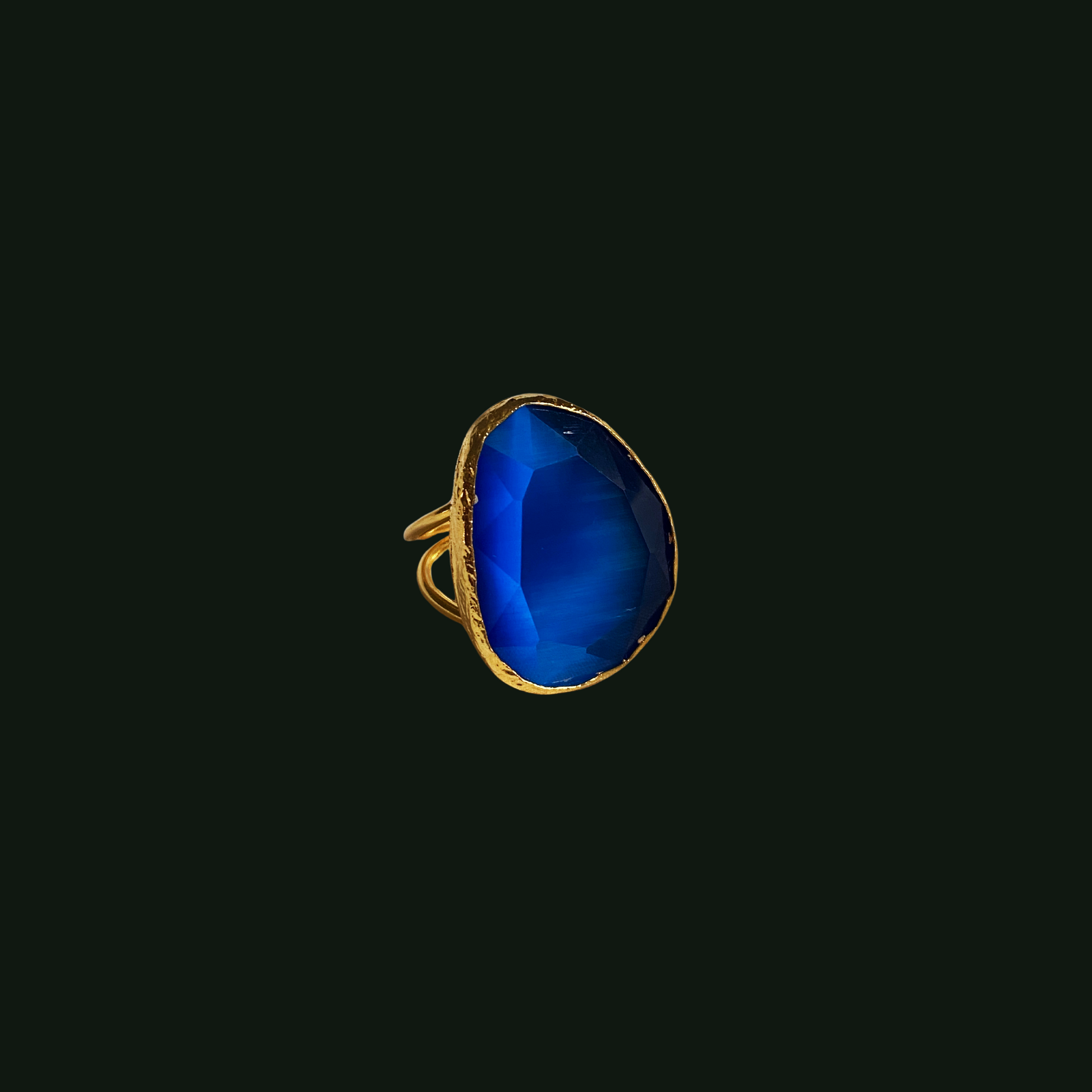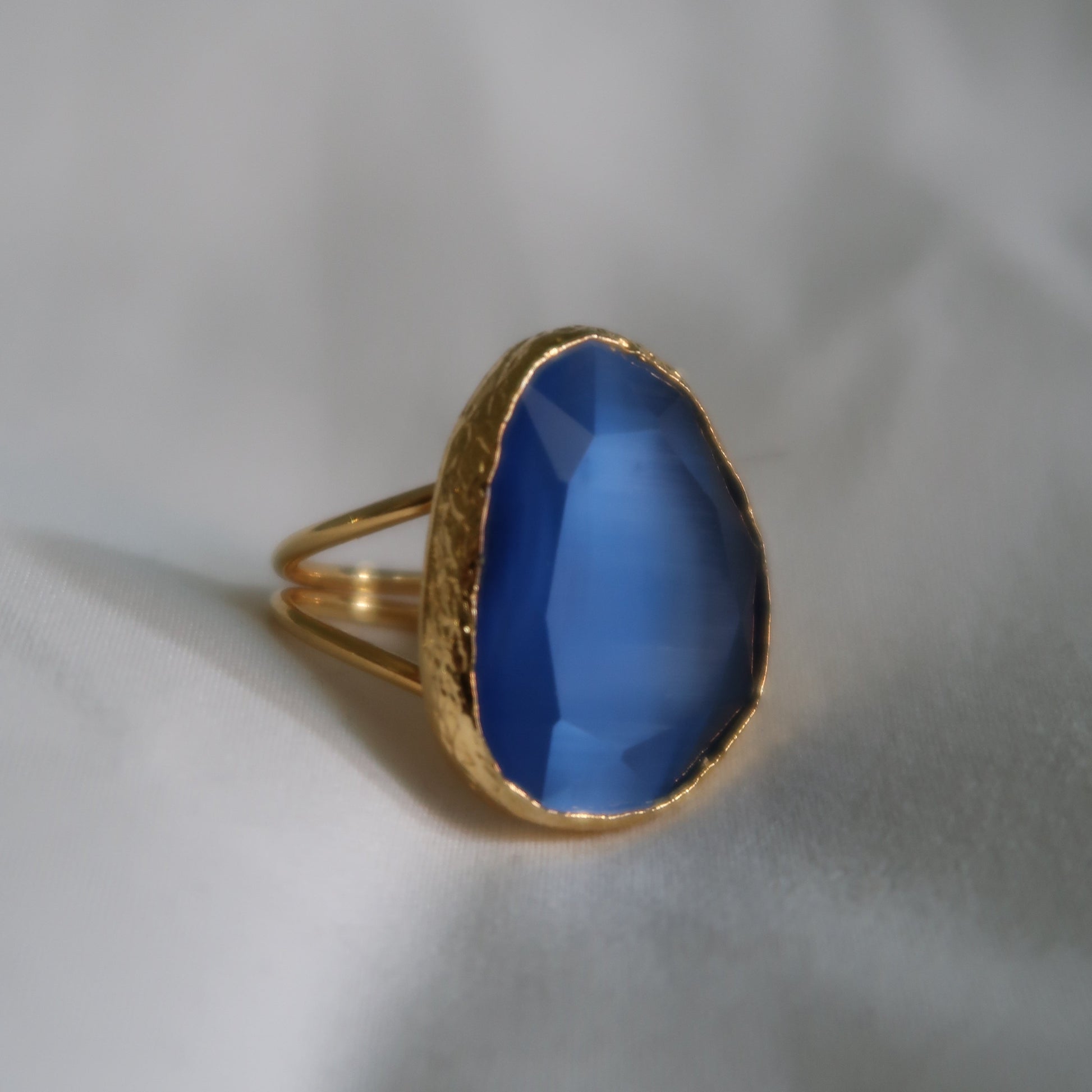 Mer is an adjustable 18k gold plating on sterling silver ring. It features a blue gem mirroring streaks of the ocean on a double wire gold band. This is the medium size in the ocean series.