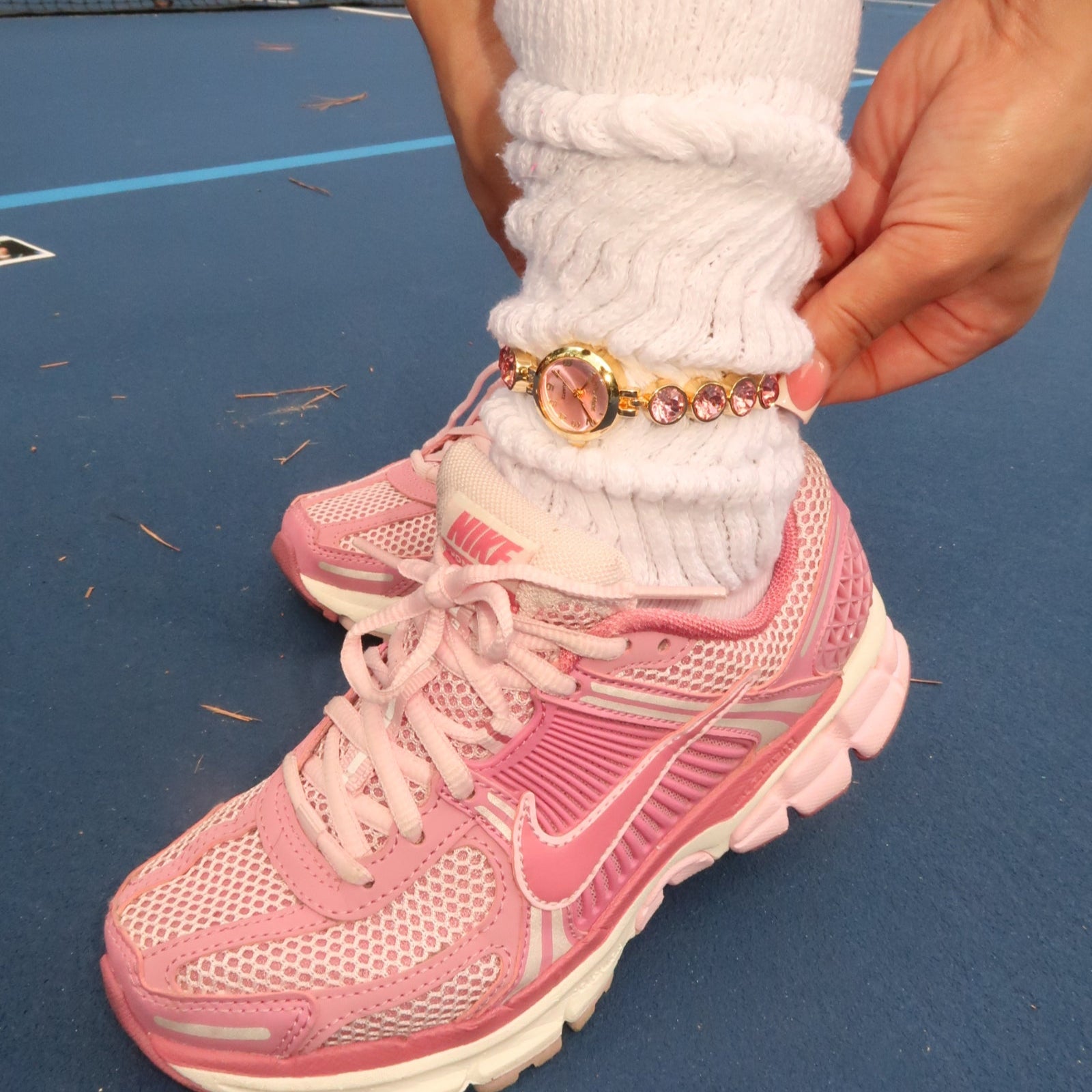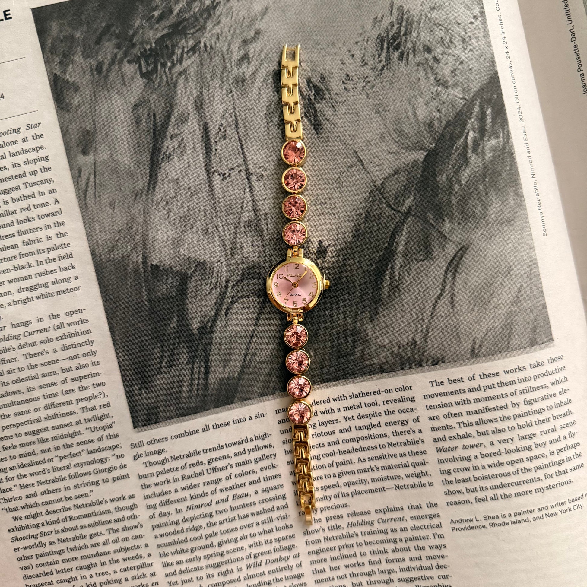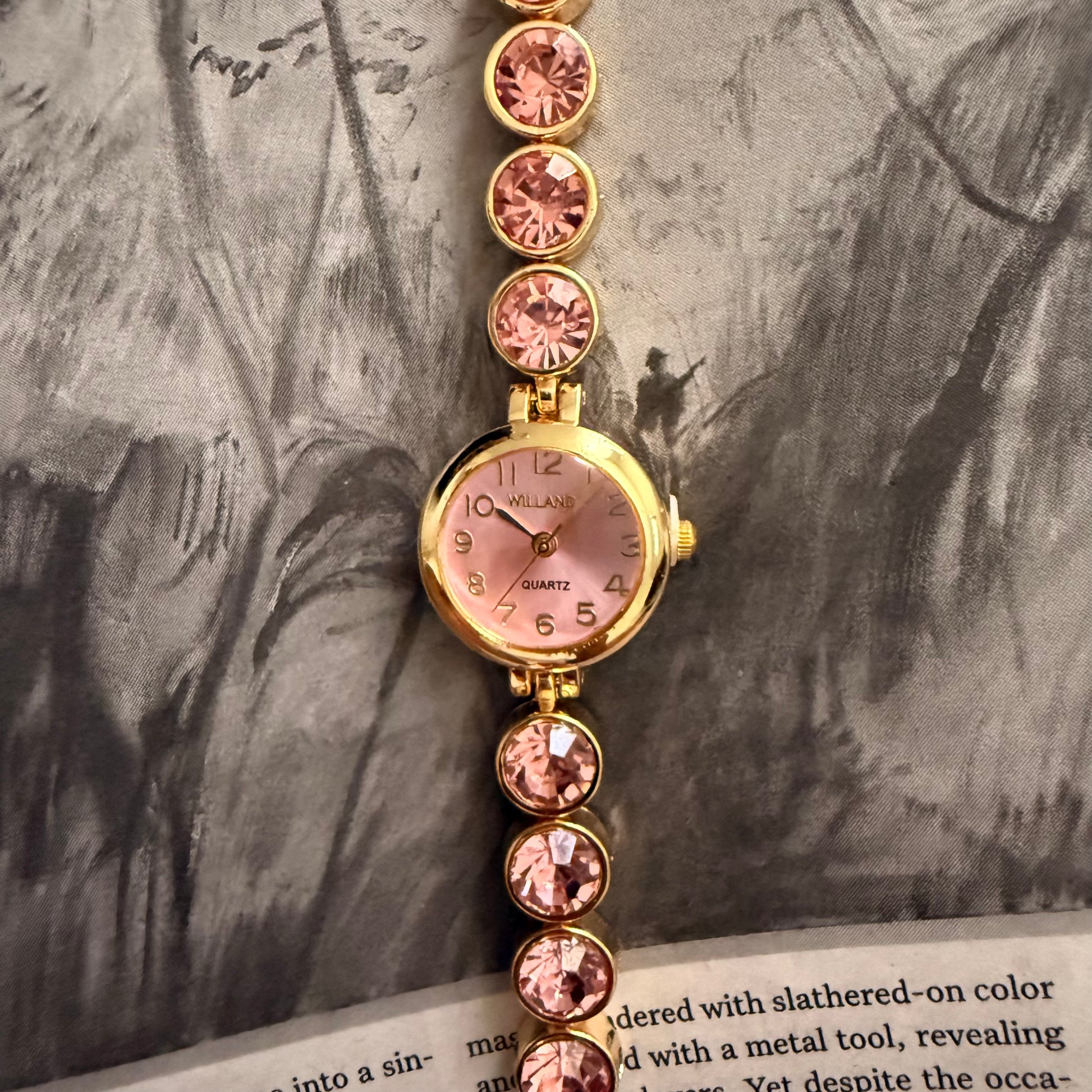 Gold pink face circle embellished band watch