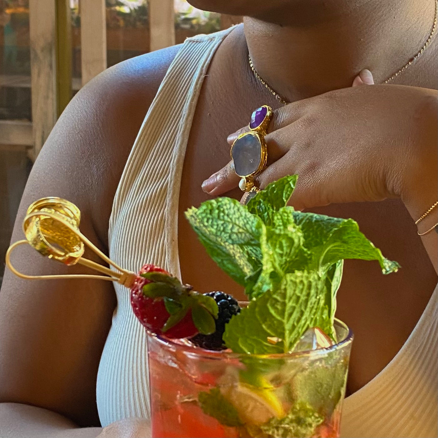Suvi is an adjustable 18k gold plating on sterling silver ring. It features a circle gem on a decorated gold band with bow detailing on the sides.
