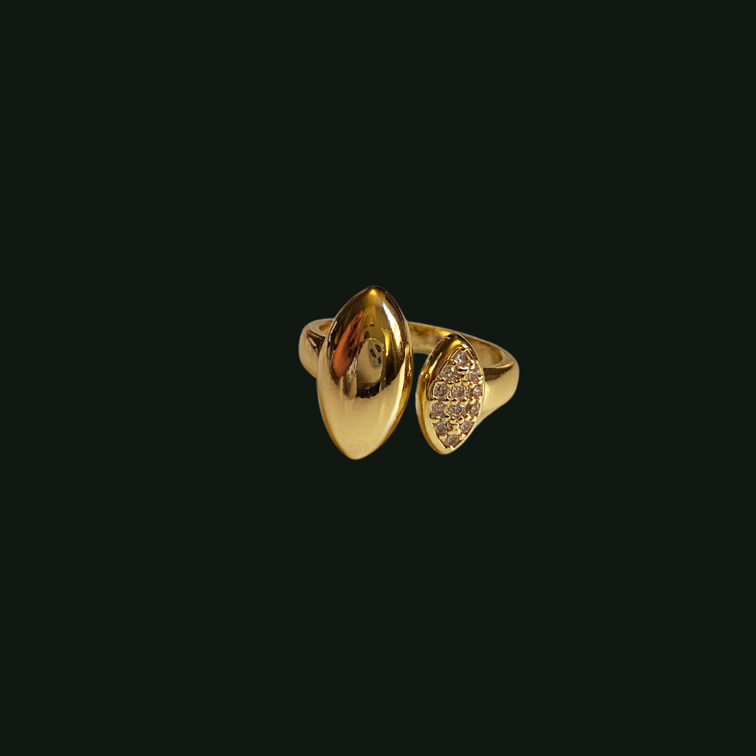 Willow is an adjustable 18k gold plated ring that features two detailed ovals with pointed ends at its front, the perfect timeless piece. Keep its shine by avoiding harsh chemicals and wiping clean with a soft cloth.